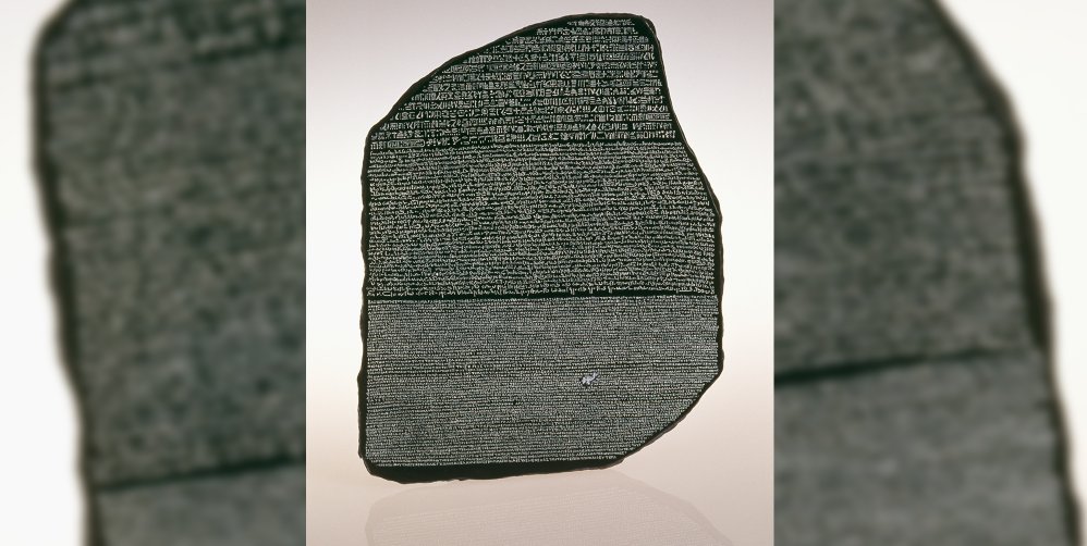 Découverte en 1799 par un officier de Napoléon, la pierre de Rosette a été un élément clef dans le déchiffrement des hiéroglyphes égyptiens en raison d’un décret qui y était inscrit dans deux langues et trois écritures différentes.