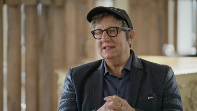 Robert Lepage démontre à Pierre-Yves Lord l'importance prépondérante des représentations de la Lune dans l'art.