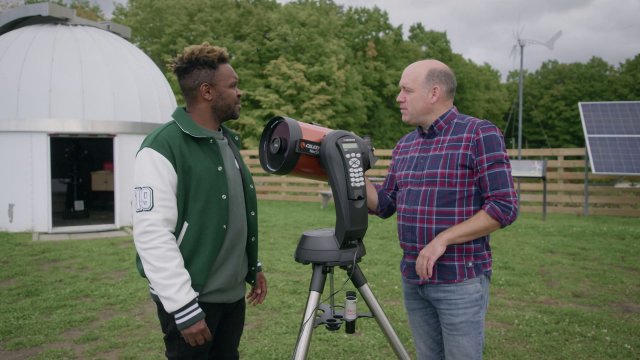 Antoine Vézina explique à Pierre-Yves Lord le fonctionnement d'un télescope puis évoque les éléments astronomiques qu'il rêverait d'observer.
